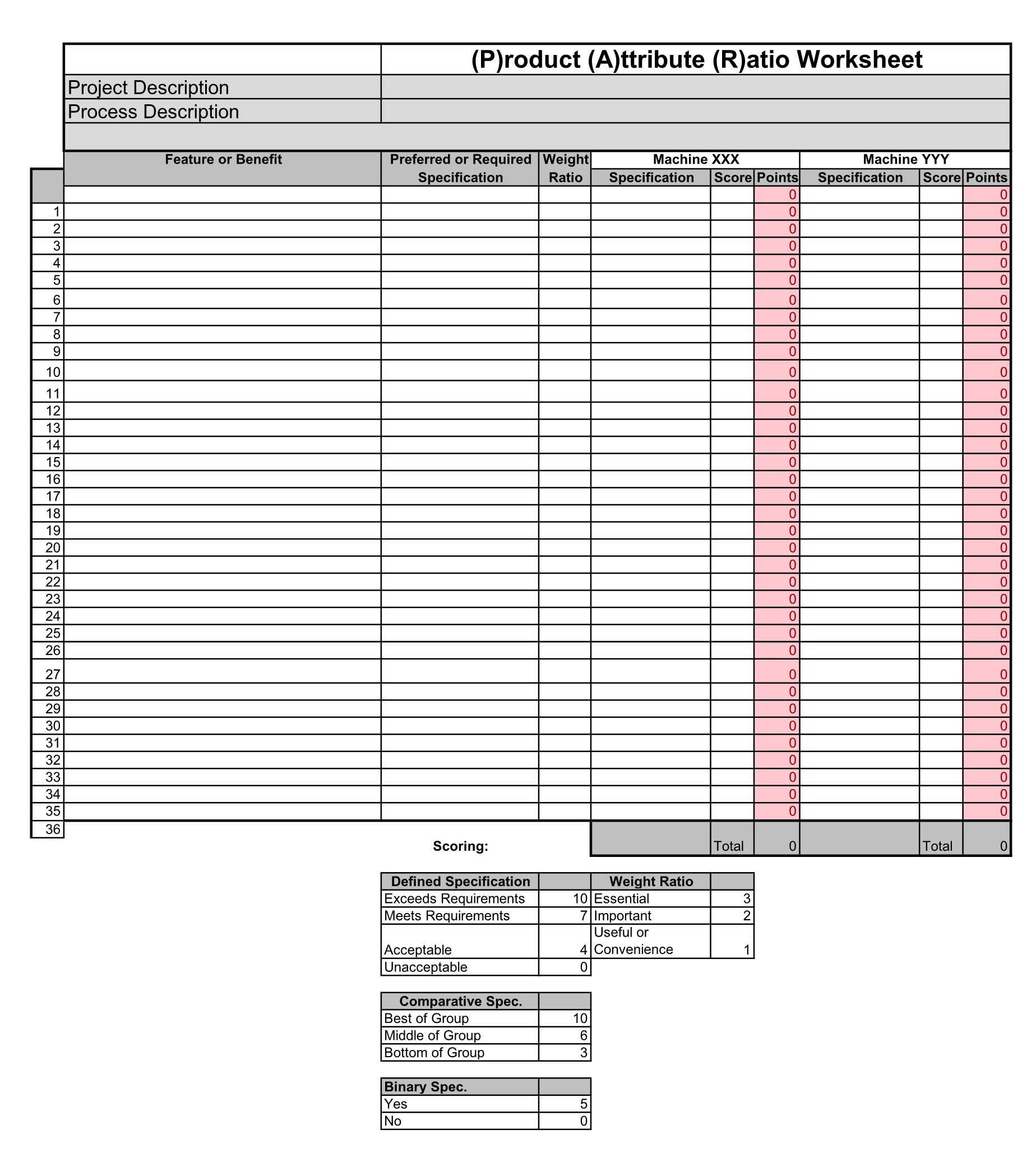 When all the semi-final quotes are in, visits to put hands on a machine have been made and customer references have been checked, it’s time to begin the decision making process in earnest. With all the documentation we have and investigation we’ve done, we have an avalanche of information to digest and are essentially in the same situation that we were with the process decision. We need a tool to help us organize and quantify all the data. This time, instead of SWOT analysis, we’re going to use a tool called a (P)roduct (A)ttribute (R)atio worksheet. A blank one looks like this: