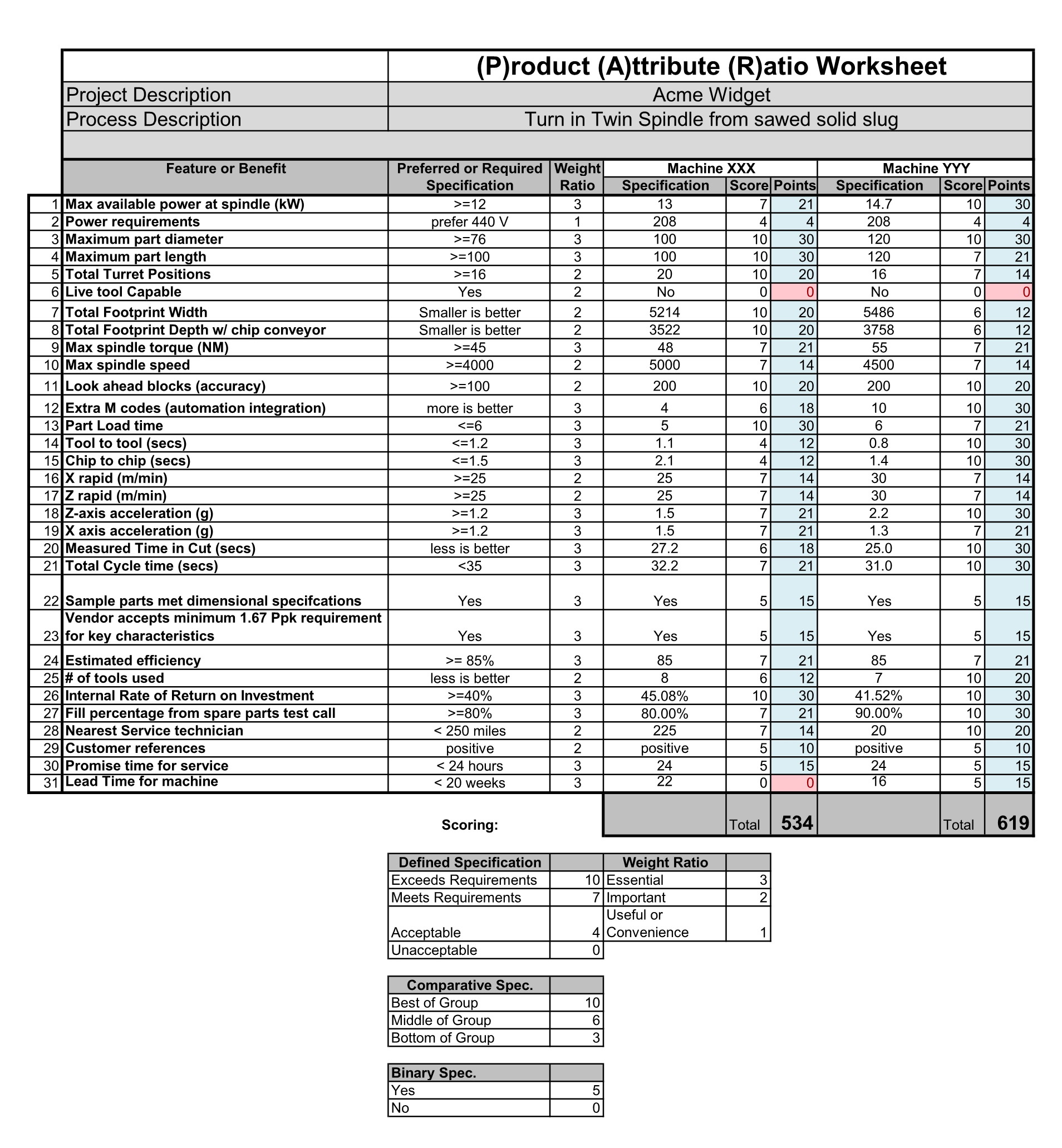 Instead of comparing broad advantages and disadvantages of a process, a PAR worksheet drills down and compares detailed specifications, features, or benefits of a particular piece of equipment. It lists the characteristic, the preferred or required specification, assigns an importance (weight ratio), lists the actual specification that the machine or vendor provides, rates that actual value using the scoring key at the bottom of the sheet and then calculates a point value by multiplying the score by the weight. Those point values are then summed for each machine for comparison.